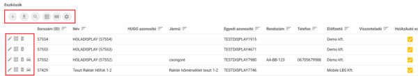 A listában balról jobbra haladva a műveleti gombok közül az első az eszköz adatainak módosítására és információk hozzáadására szolgáló ceruza ikonnal jelölt gomb, mellette az eszköz QR kódját megjelenítő ikon, jobbra az eszköz törlésére szolgáló szemetesláda ikon, ettől jobbra - ha az eszköz rendelkezik aktív jármű összerendeléssel - egy személyautó ikonnal jelölt gomb található.