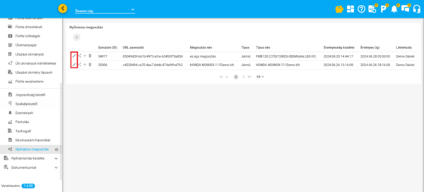 A lista bal szélén elhelyezett ceruza ikonra kattintva nyílik meg a megosztás adatainak kezelőfelülete.