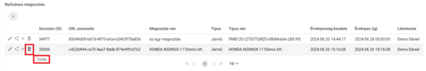 A kuka ikonra kattintva az adott megosztás törölhető, tehát az URL érvényessége ebben az esetben azonnal lejár.
