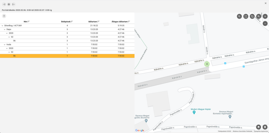 Az eredményt egy lenyitható táblázatban találja a felhasználó, amelyben az érintések számát a lekért időszakban az egyes POI-k szerint napokra bontva jeleníti meg. A táblázatban egy kiválasztott napra kattintva a térképen megjelennek a belépések, kék bólyával jelölve.