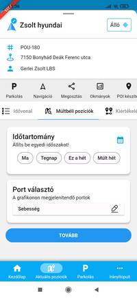 Itt fülek között lapozva válthatsz az Adatok, Idővonal, Múltbéli pozíciók, Kiértékelés és Értesítések funkciók között. Bármelyik fülre lapozol, mindegyik funkció az adott eszközre lesz előre beállítva, így például könnyen és gyorsan készíthetsz a térképről is múltbéli pozíciók lekérdezést az adott eszközre vonatkozóan.