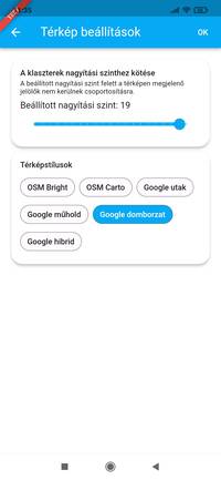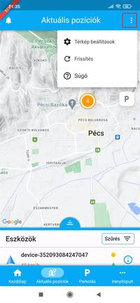A fejléc jobb szélén található három pont ikonra kattintva frissítheted manuálisan a térképet, eléred a súgót és be tudod állítani a térkép megjelenését.