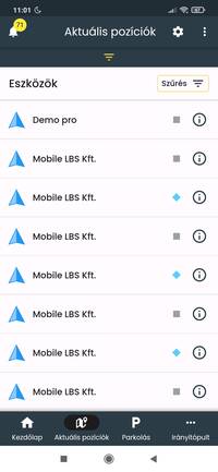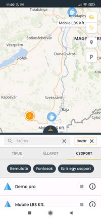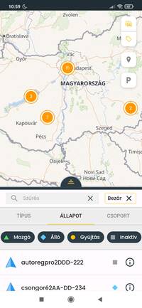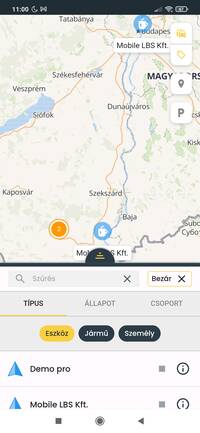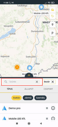 A webes felülettel megegyező módon a mobilalkalmazásban is elérhető az eszköz, a jármű és a személy (azonosított sofőrök) típusok megjelenítése. A listában és a térképen megjelenő tartalmat nem csak típus, hanem állapot és csoportba rendezés alapján is szűrheted.