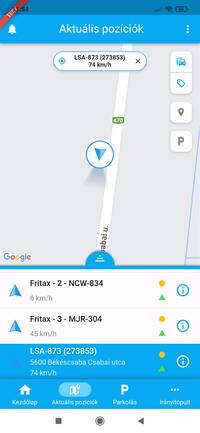 Az Aktuális pozíciók felületén az előfizetésednek megfelelő (OSM vagy Google) térképen nyomon követheted eszközeid mozgását. Az álló helyzetben lévő eszközöket kávéscsészével, a mozgó eszközöket iránymutató nyíl formájában, vagy a webes felületen beállított ikonnal és színnel jelenítjük meg számodra.