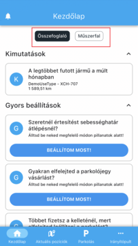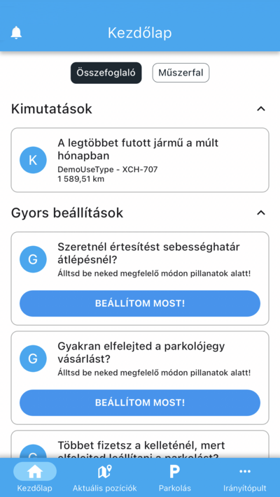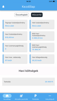 A bejelentkezést követően az alkalmazás a Kezdőlap felületre fog betölteni. Az alkalmazáson belüli navigációhoz az alsó navigációs sáv lesz a segítségedre. Itt tudsz lapozni a Kezdőlap, az Aktuális pozíciók, a Parkolás és további funkciók elérése érdekében az Irányítópult felületére.