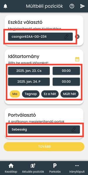 - eszköz kiválasztása (ha az aktuális pozíciókból, az eszköz adatlapról navigáltál ide, ezt a mezőt az app automatikusan kitölti)